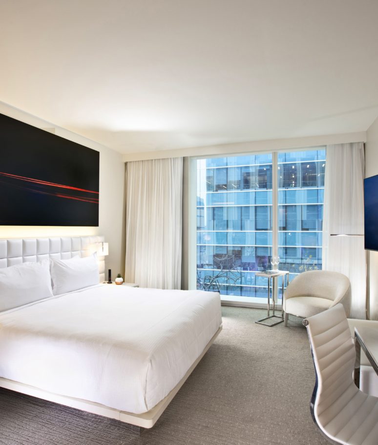 Our HALL Deluxe 1 King ADA Hearing Accessible room combines luxurious comfort and modern sophistication with views of Downtown Dallas or the Arts District. Ranging from 344-377 square feet, this room is complete with a king bed, curated photography of the surrounding arts district and custom furnishings created by award-winning NY interior design firm, Bentel & Bentel.
